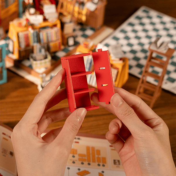 Unlock the charm of The Study DIY Book Nook, where rich mahogany bookshelves line the walls and a leather armchair invites you to pause. A spiral staircase leads to a hidden loft, filled with classic volumes, a green-shaded desk lamp, and brass-rimmed globes. Elegant flower vases, a ticking wall clock, and intricate wall panelling add character to this scholarly space. A warm ambient glow from built-in LED lights enhances every detail. This intricate kit offers a meditative build and a stunning display piece that celebrates thought, solitude, and imagination.