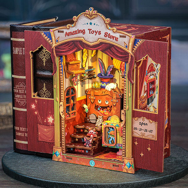 Bring the magic of make-believe to life with the Amazing Toy Store DIY Book Nook Kit. This cheerful miniature features brightly painted shelves, a wooden rocking horse, and classic toys displayed in glass cabinets. A winding staircase leads to a loft filled with boxes and teddy bears, while LED lighting adds a warm festive glow to the striped awning, vintage signs, and checkered floor. Every corner is filled with whimsy — from dolls and trains to stacked puzzles and tiny gift bags. Perfect for holiday décor or year-round delight, it’s a magical build for all ages.