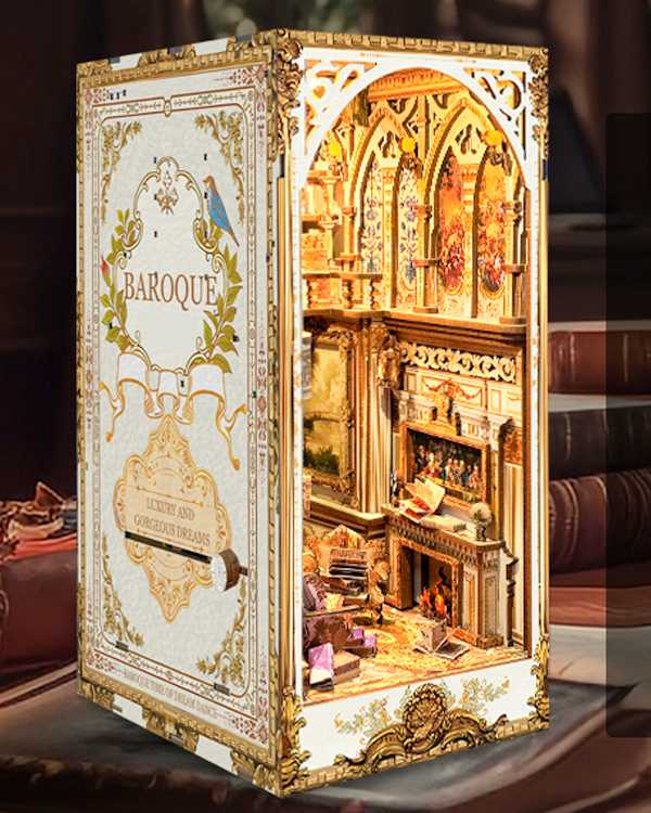 Discover lavish elegance with the Baroque Dreams DIY Book Nook Kit. This exquisite miniature showcases elaborate ceiling frescoes, ornate gilt frames, murals, paintings and sweeping marble columns that evoke the splendour of a grand palace. Warm LED lighting casts a golden glow over intricate floral carvings, gilded accents, and antique furnishings, bringing the scene to radiant life. Perfect for lovers of classical art and architectural beauty.