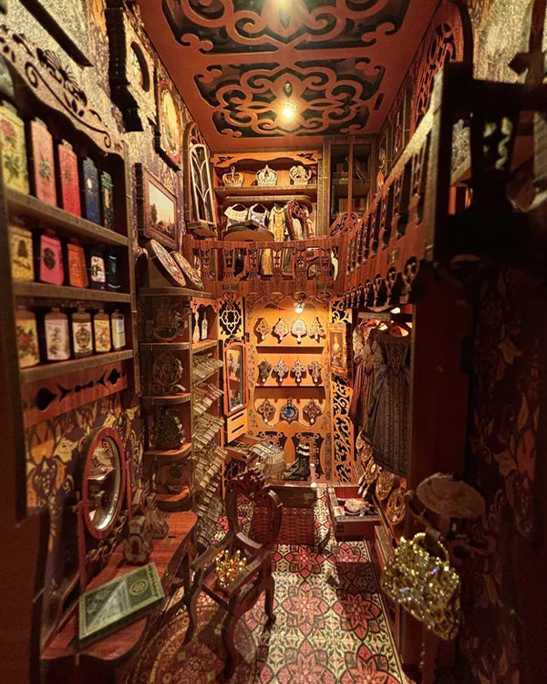 Step into a world of elegance and forgotten stories. This beautifully detailed miniature captures the charm of an aristocratic dressing room, complete with ornate wardrobes, flowing gowns, antique mirrors, and delicate accessories tucked into every corner. Faded wallpaper and carved woodwork set the scene, while soft LED lighting casts a warm glow over polished floors and vintage décor. From a lone glove resting on a velvet bench to perfume bottles and open drawers every detail evokes quiet luxury and timeless intrigue. Perfect for lovers of period drama, romantic fantasy, and those who cherish the beauty of a forgotten era.