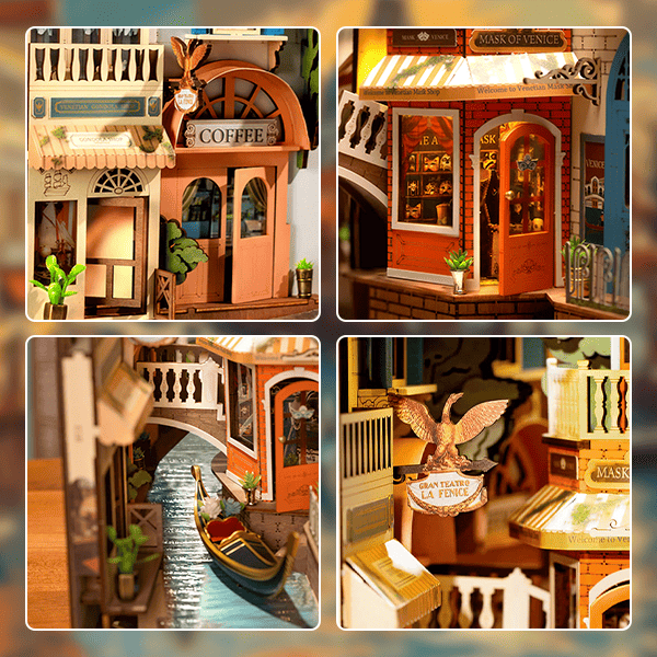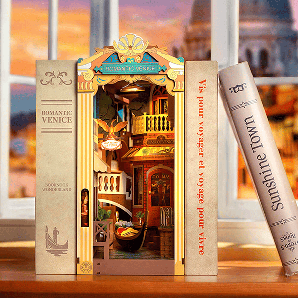 Transport yourself to the heart of Italy with the Romance In Venice DIY Book Nook Kit. This breathtaking miniature scene features arched bridges, stone pavements, a flower-draped balcony, and a charming canal-side café. Soft LED lighting spills from window shutters, casting a warm glow over the wrought-iron streetlamp and gondola mooring post. Every corner is rich in atmosphere and storybook romance. Whether you're an avid crafter or a lover of beautiful places, this kit brings the magic of Venice right to your shelf.