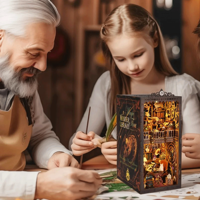 Enter a world where time stands still and stories come alive with the Magic Time Wonder Library Book Nook. A miniature diorama filled with towering shelves filled with ancient books, delicate clockwork, and glowing lanterns creating the perfect blend of fantasy and wonder. Arched windows dusted with stardust frame a cosy reading nook, while carved wood and vintage hourglasses add timeless elegance. Soft LED lighting highlights every intricate detail, from swirling clock faces to scattered papers. Turn any bookshelf into a portal of wonder and imagination.