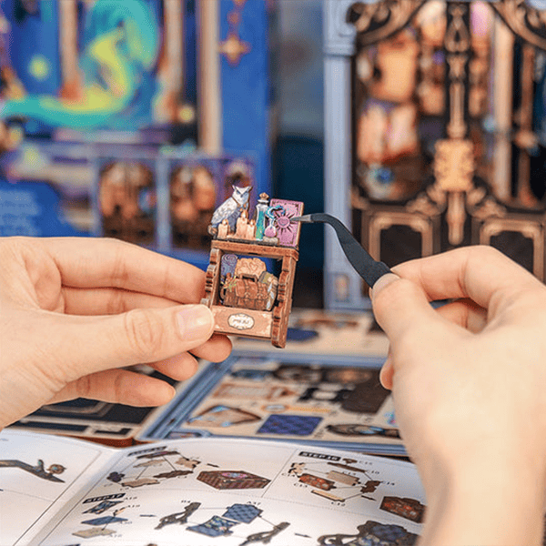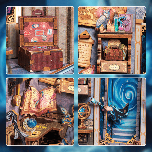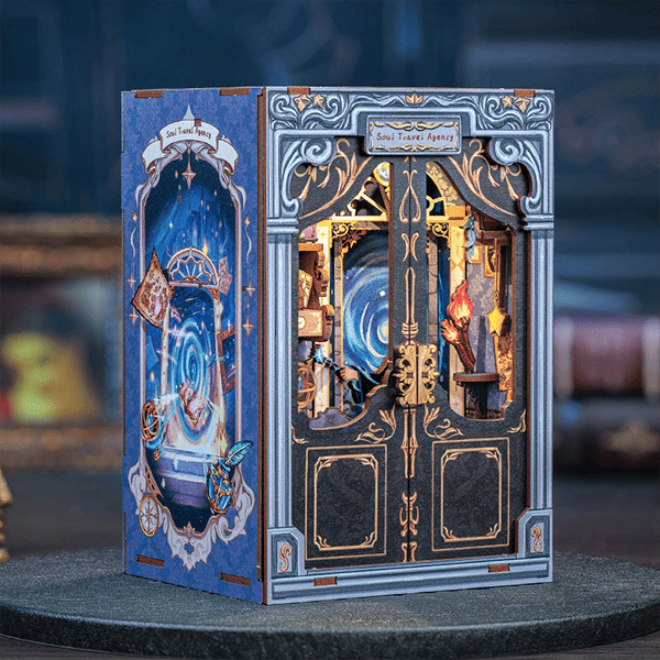 Enter the mystical world of the Soul Travel Agency, a portal to enchanted destinations beyond reality. This intricate DIY book nook features spiral stairs, glowing orbs, and a floating doorway that invites your imagination to wander. Discover tiny posters, a countertop desk, and a glowing welcome sign that sets the mood for fantasy-fuelled adventures. With layered textures, magical lighting, and surreal detail, it’s more than décor—it’s a gateway for dreamers. An unforgettable gift or centrepiece for anyone who believes in journeys of the soul.