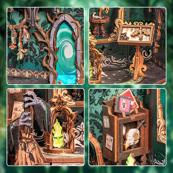 Step into a forbidden greenhouse with The Darkness Herbarium DIY Book Nook Kit. This bewitching scene features twisting vines, glowing glass jars, and rare magical plants growing from cracked stone planters. A circular staircase leads past herbal tomes, hanging roots, and a skull-adorned workbench. LED lights cast an eerie glow over the arched windows, dark wooden shelves, and potent elixirs in tiny bottles. Every detail whispers secrets of the arcane and the botanical unknown. Perfect for fans of fantasy, witchcraft, and those who love their magic served with a hint of mystery.