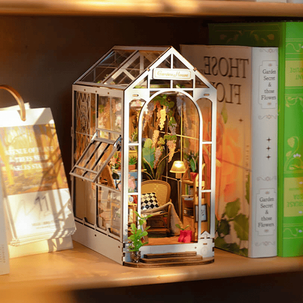 Bring your bookshelf to life with the Summer Garden House DIY Book Nook Kit. This enchanting miniature scene features vibrant flower beds, a white garden chair, spiral staircase, and a cosy glass-roofed porch. Soft LED lighting casts a warm summer glow over the wooden steps, watering can, and cobblestone floor. Every element is finely detailed to create a peaceful, hands-on escape. Ideal for hobbyists, collectors, or as a heartfelt gift, this kit delivers a touch of seasonal magic to any shelf.