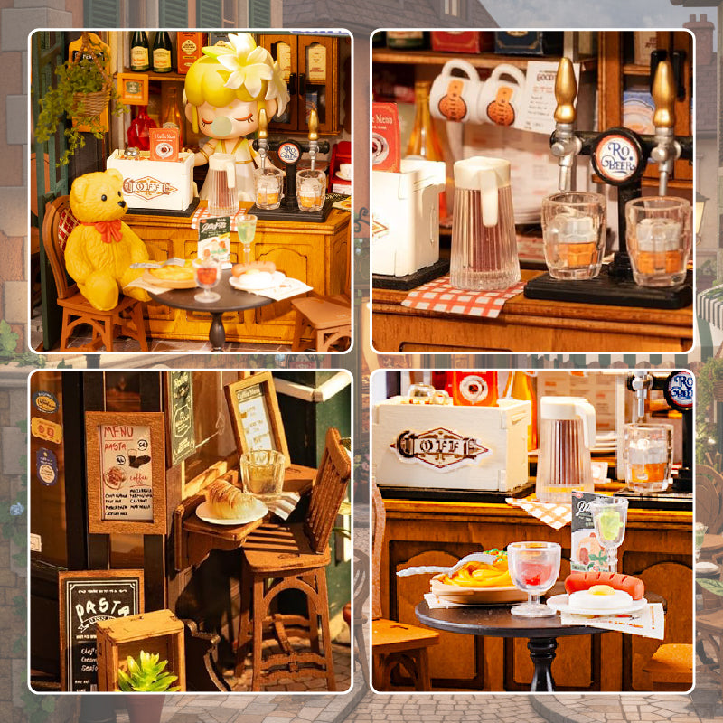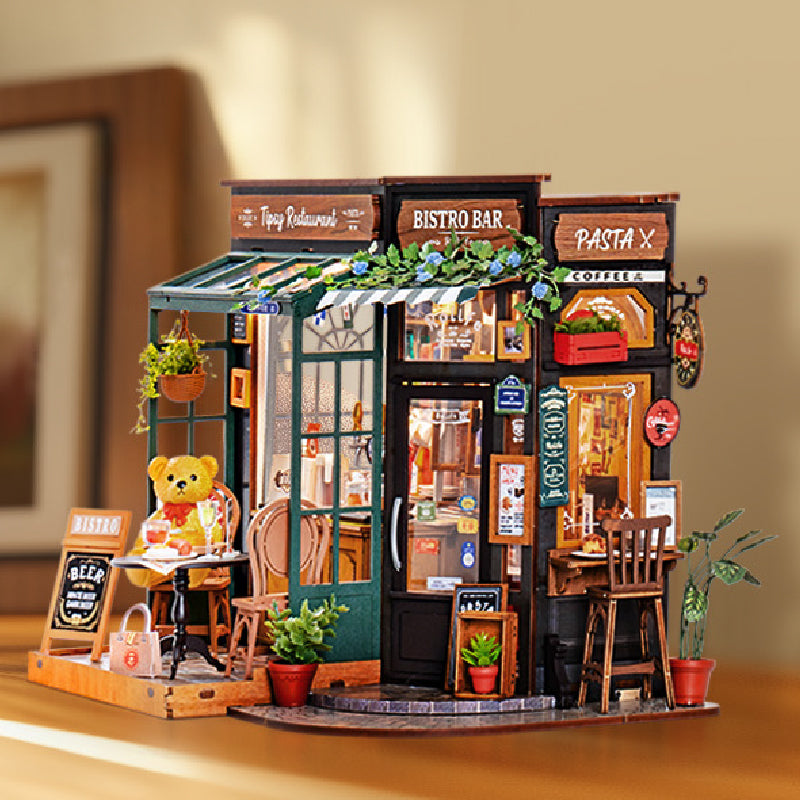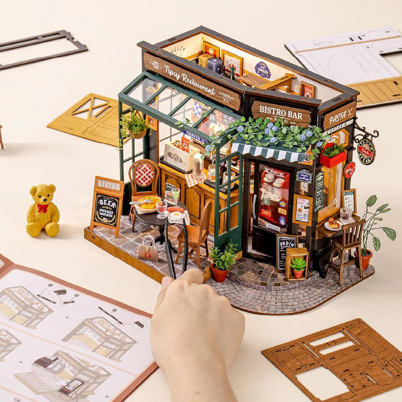 The Tipsy Restaurant DIY Miniature model invites you to craft a vibrant little world brimming with character and charm. As you assemble each piece, a story unfolds. Rustic shelves stocked with bottles and pastries, polished tables waiting for guests, and intricate décor that captures the bustling spirit of a lively bistro. Every detail, from the hanging utensils to the cosy seating, feels alive with personality, while the soft LED lighting transforms the scene into a warm, glowing escape once night falls. More than just a project, this build offers a chance to slow down, immerse yourself in creativity, and create a display piece that radiates the magic of café culture and the joy of shared moments.