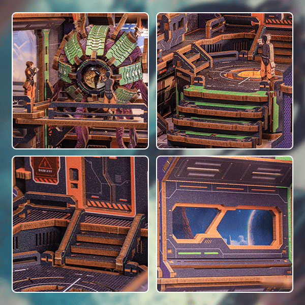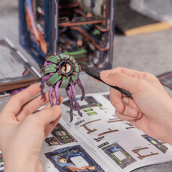 Enter the realm of forgotten gods with The Eye of Old God DIY Book Nook Kit. This otherworldly scene features a towering stone altar, glowing sigils, and the watchful eye suspended above swirling shadows. A crumbling spiral staircase, dark temple walls, and ancient runes add to the sense of eerie reverence. LED lighting illuminates the etched floor, mystic arches, and eldritch relics, casting a supernatural glow throughout. Every detail evokes cosmic horror and arcane legend — ideal for fans of Lovecraftian lore, dark magic, and mysterious miniature worlds.