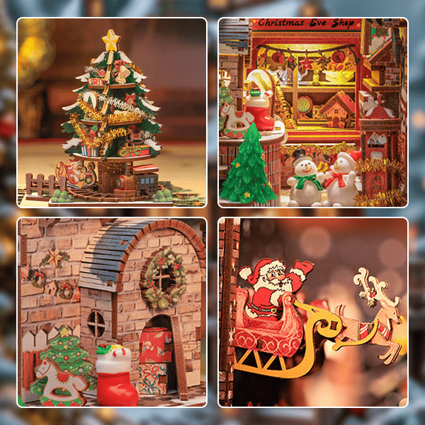 Capture the spirit of the season with the Christmas Wish Store DIY Book Nook Kit. This enchanting festive scene features a snow-dusted shopfront, glowing lanterns, and a charming display of wrapped gifts. Inside, discover tiny toy shelves, a firelit reading nook, and a festive wreath above the door. LED lighting brings the scene to life, casting a cosy glow over the candy-striped staircase, miniature Christmas tree, and wooden floorboards. From the hanging garlands to the handwritten wish list, every detail adds a touch of yuletide magic — perfect for holiday decorating, gifting, or festive family crafting.